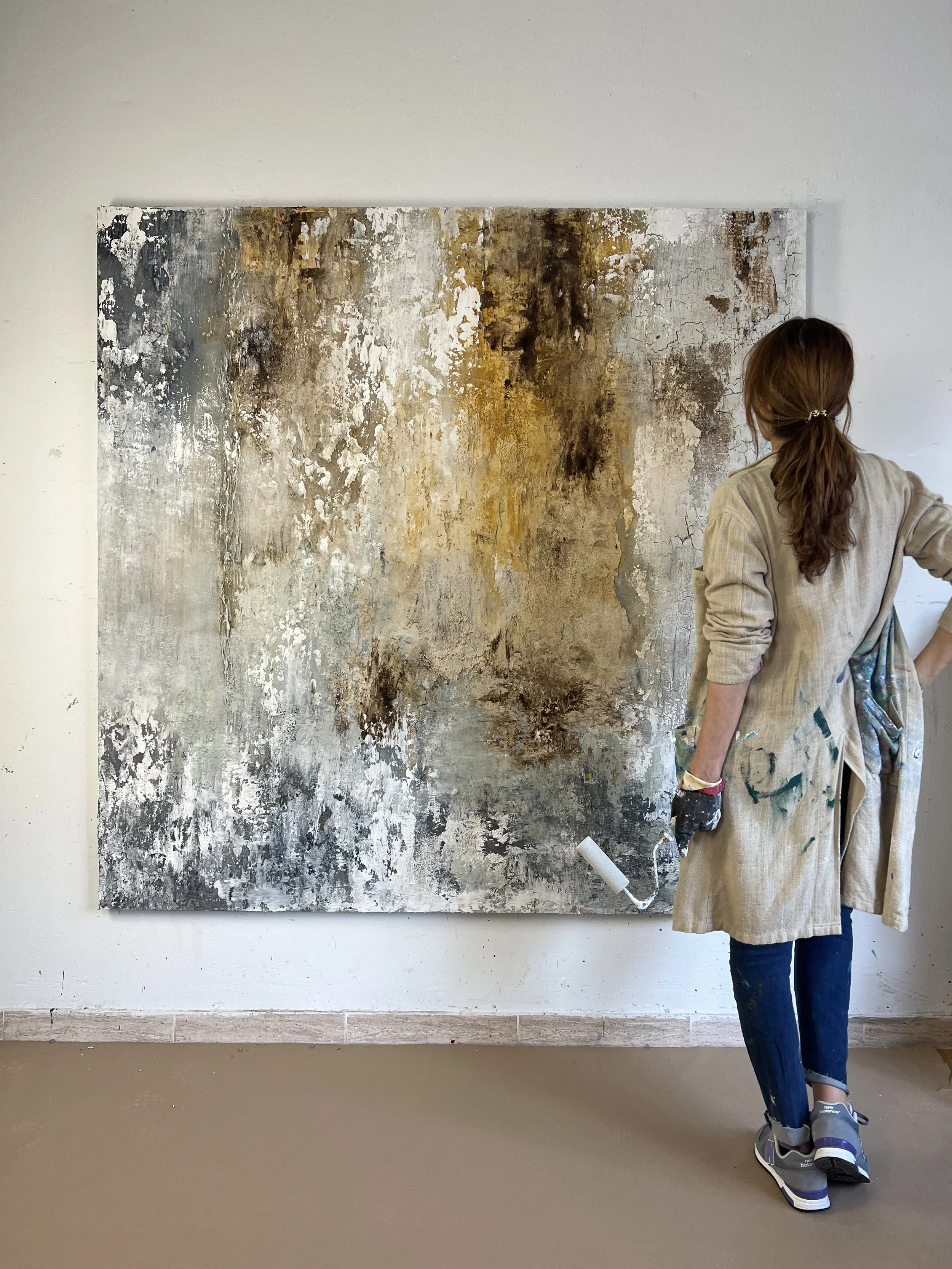 Tengo dos maneras de plantearme una obra: Una de forma planificada y controlada, donde la materia y la técnica cuentan la historia. La otra forma es más intuitiva, sin materia, ni pinceles solo con pigmentos y resinas intento que el color y las formas tengan su propio lenguaje protagonista.